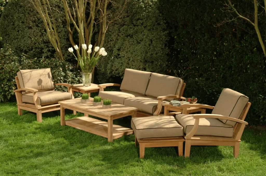 Harthölzer wie Teak oder Eukalyptus sind robust, wetterbeständig und fügen sich harmonisch ins Grün ein.