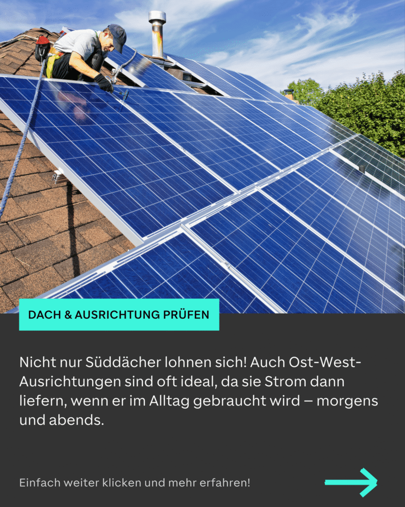 Die klassische “perfekte” Ausrichtung nach Süden ist zwar immer noch sehr gut, aber längst nicht mehr die einzige rentable Option. Eine Ost-West-Ausrichtung ist für viele Haushalte sogar ideal, da der Strom morgens und abends produziert wird – genau dann, wenn der Verbrauch durch Kochen, Waschen oder das Laden des E-Autos am höchsten ist.